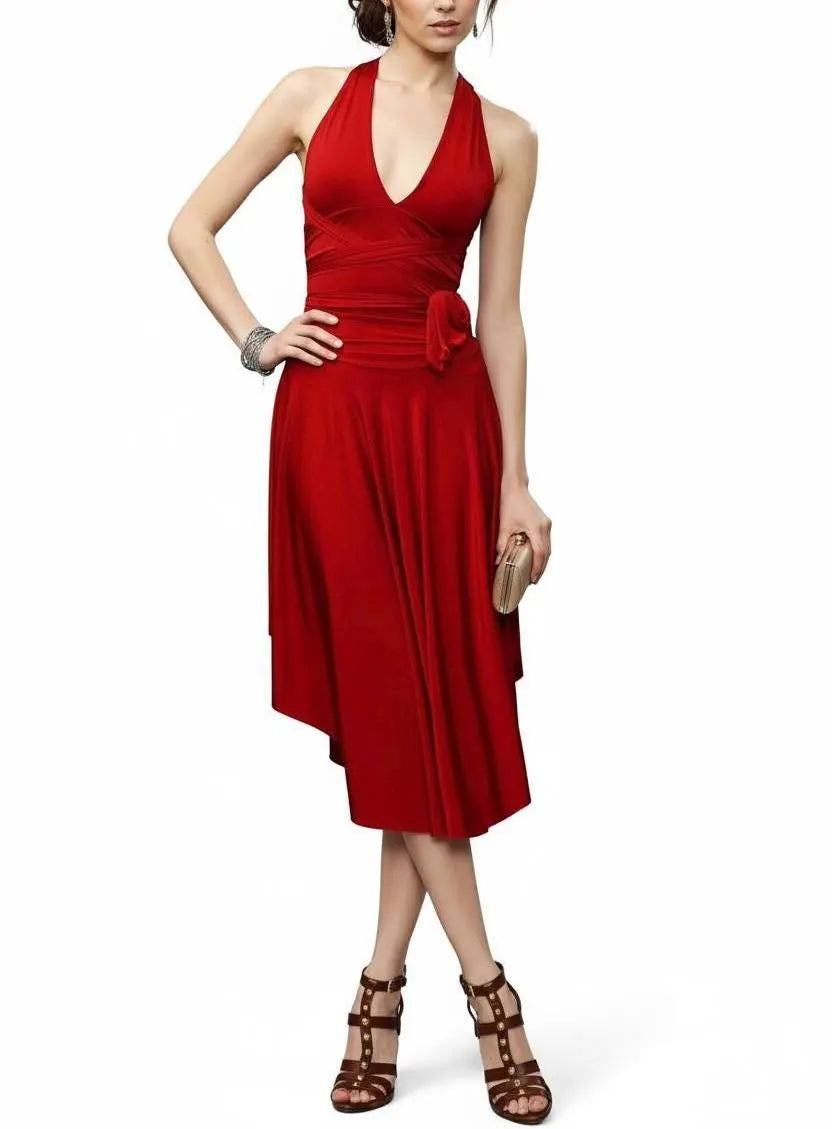 The multi-way infinity design allows you to wrap and tie the dress in a variety of styles, including halter, crossed, or wrapped looks, making it a perfect choice for different occasions, moods, and body types. The adjustable wrap bodice cinches the waist, while the flowing midi skirt creates an elegant, feminine silhouette.