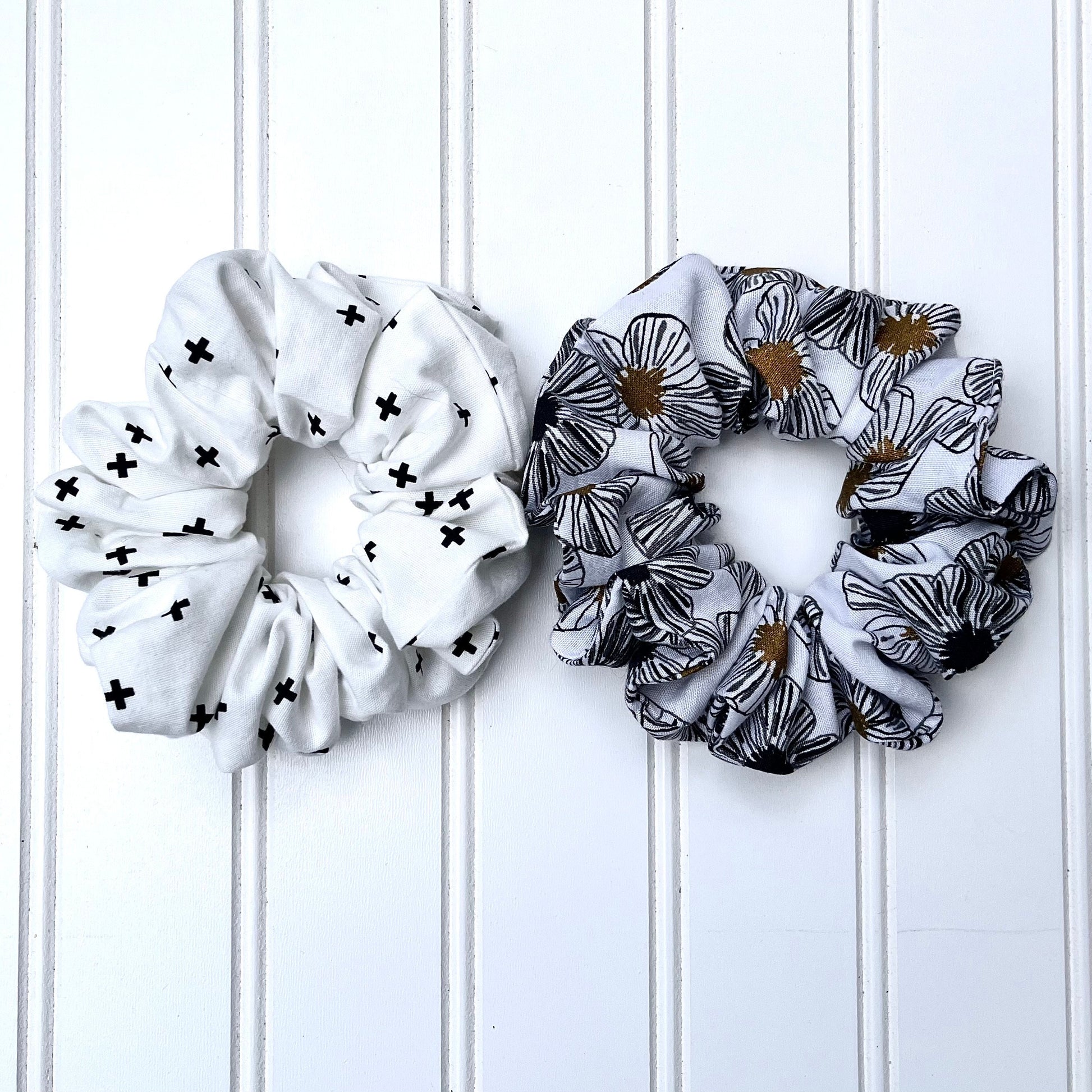 Black and White Cotton Scrunchies: Floral & Criss Cross Prints