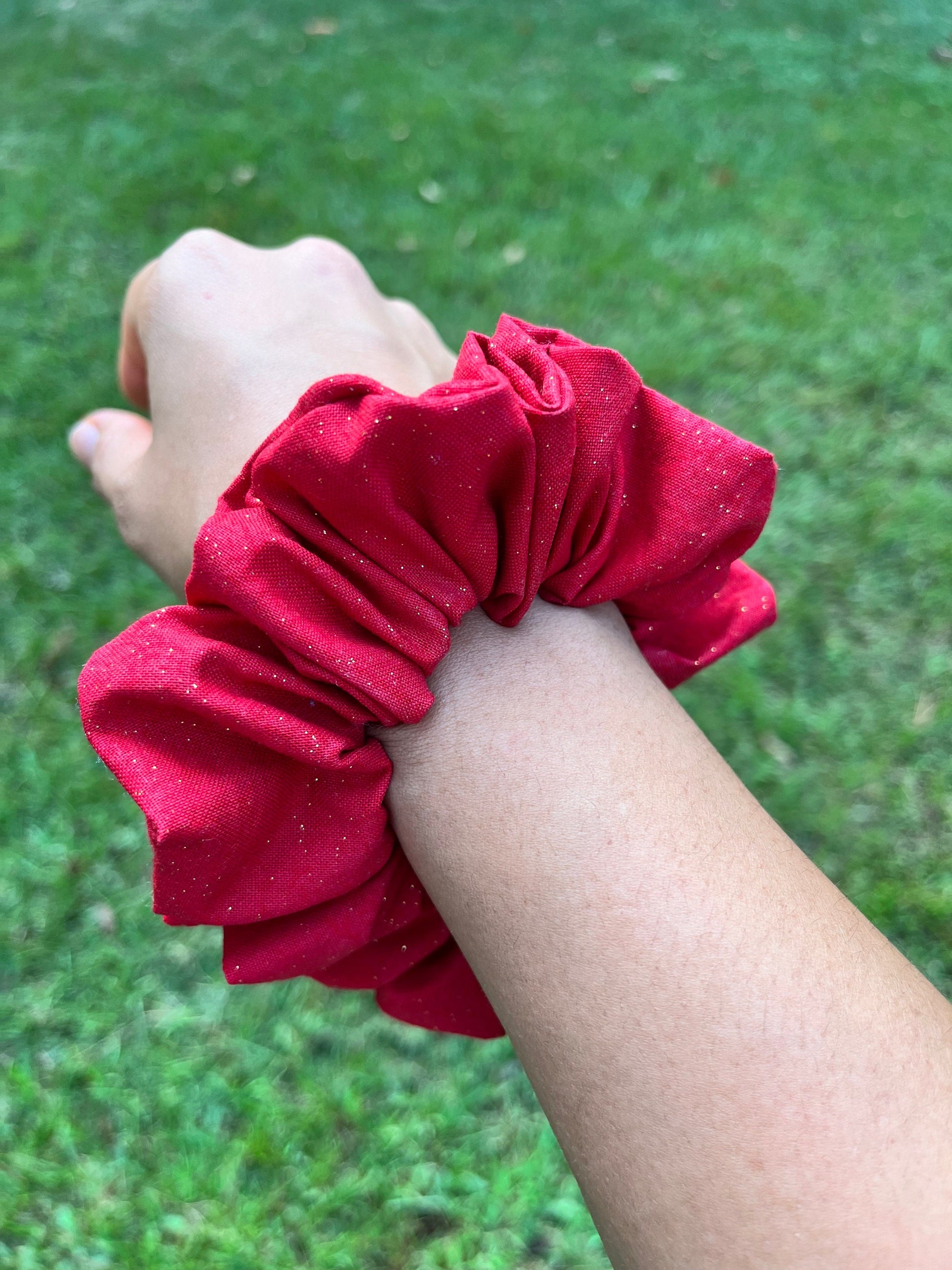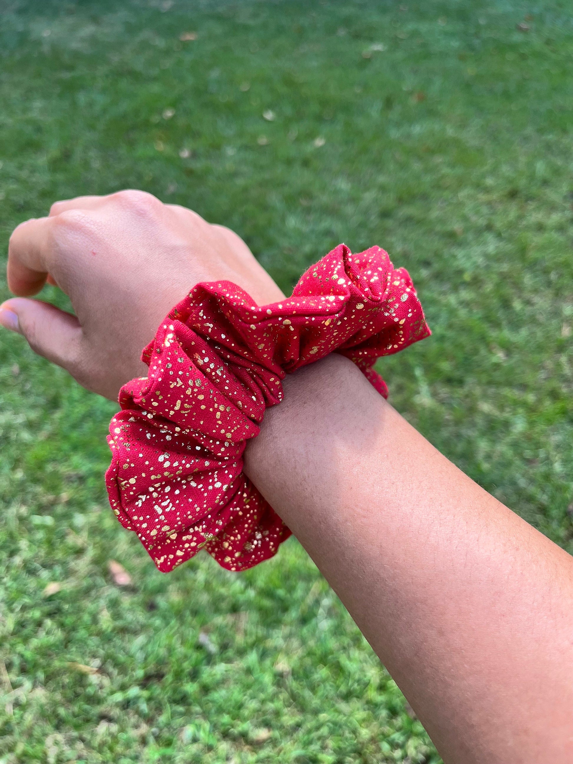 Bold and festive holiday scrunchie set is a must have for gifts for the holiday season. These are in a bright shade of red with a little shimmer and shine and pops of gold metallic accents. These must have cute colors are made with high quality premium 100% Cotton fabrics and made for both kids and adults alike. Great for curly, straight, or thick hair, as well as heavy hair types for a carefree up or down style. Can be wrapped around the hair once or twice.
