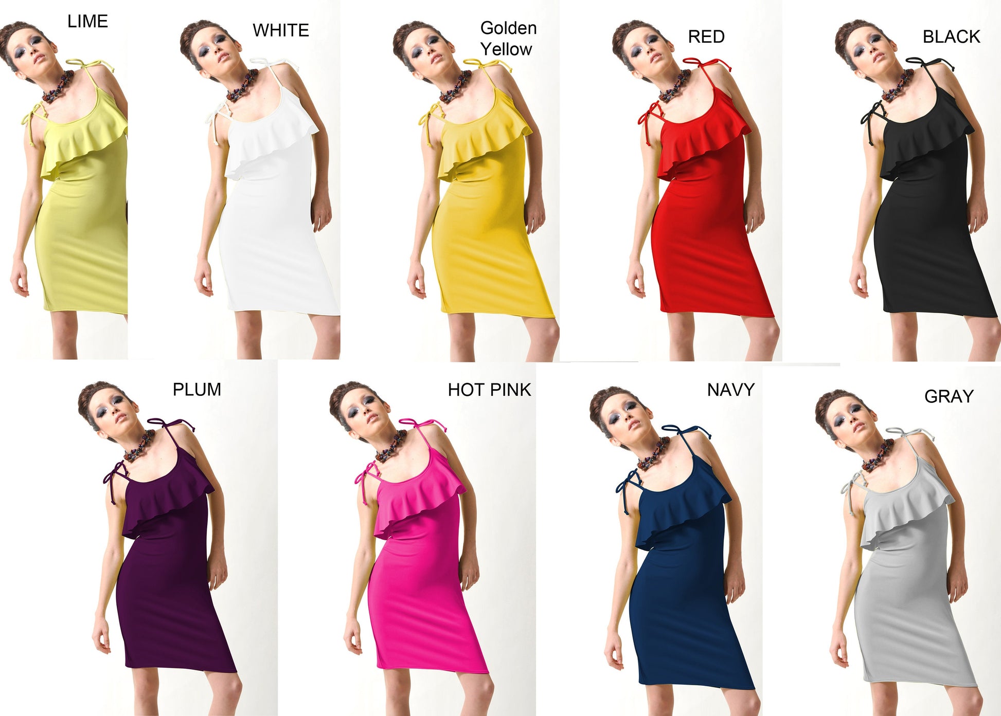 This double-knit dress features self-tying straps at the shoulders and a light flounce. It is fitted and double lined for added support, which makes it easy to wear, no shape wear needed. Shown in a bright and vibrant color choice, but available in other selections as well.