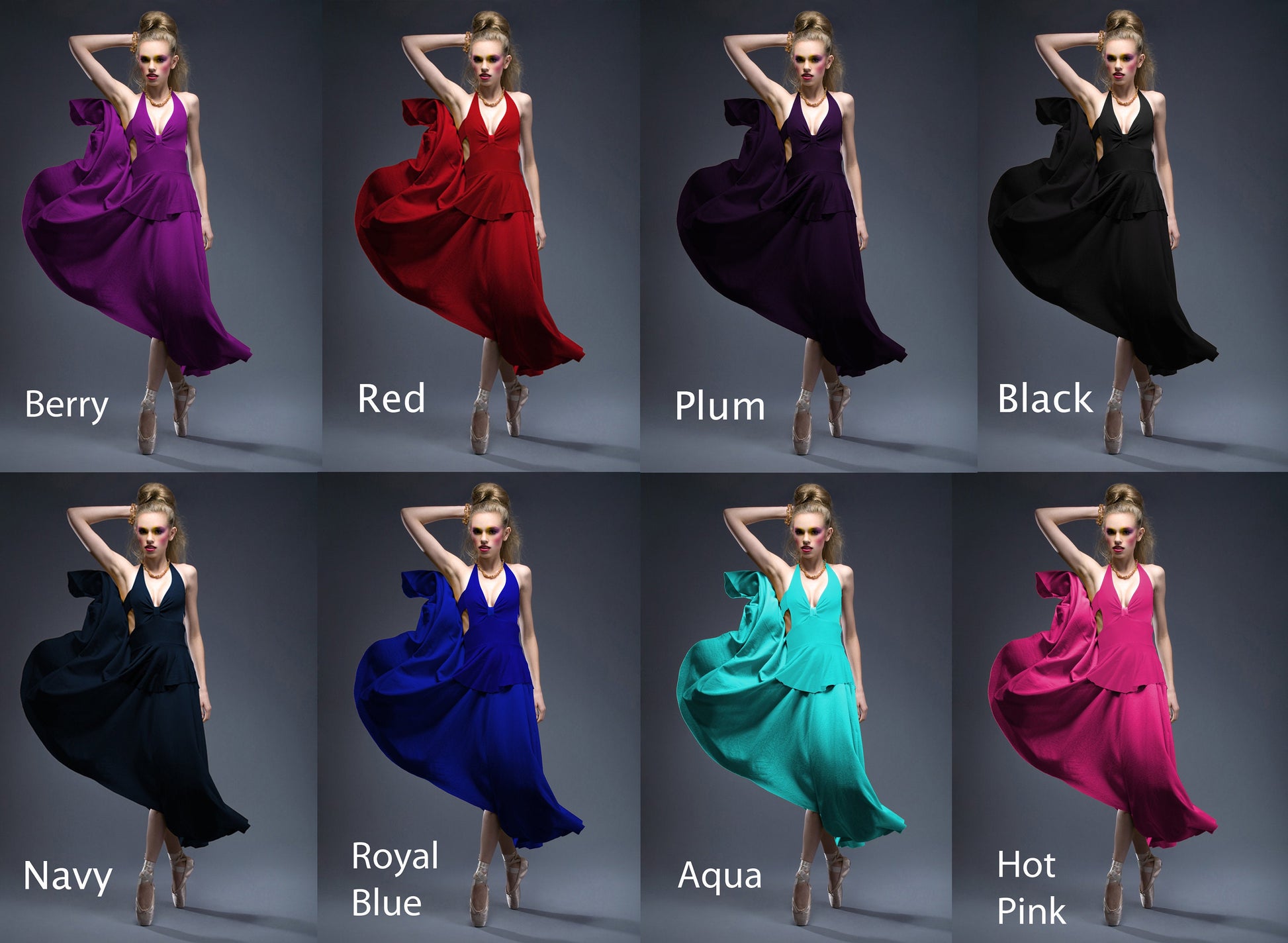 This Dress features a cinched detail at the bust area, creating a flattering and feminine silhouette. The halter neckline provides support as well as a stylish 50s retro touch. The dress is a midi length that falls just around the calf area. It can be a versatile and elegant option for various occasions, depending on the color choose, and the overall design. The peplum detail adds volume and structure to the waist as it flares out giving the illusion of an over exaggerated hourglass figure.