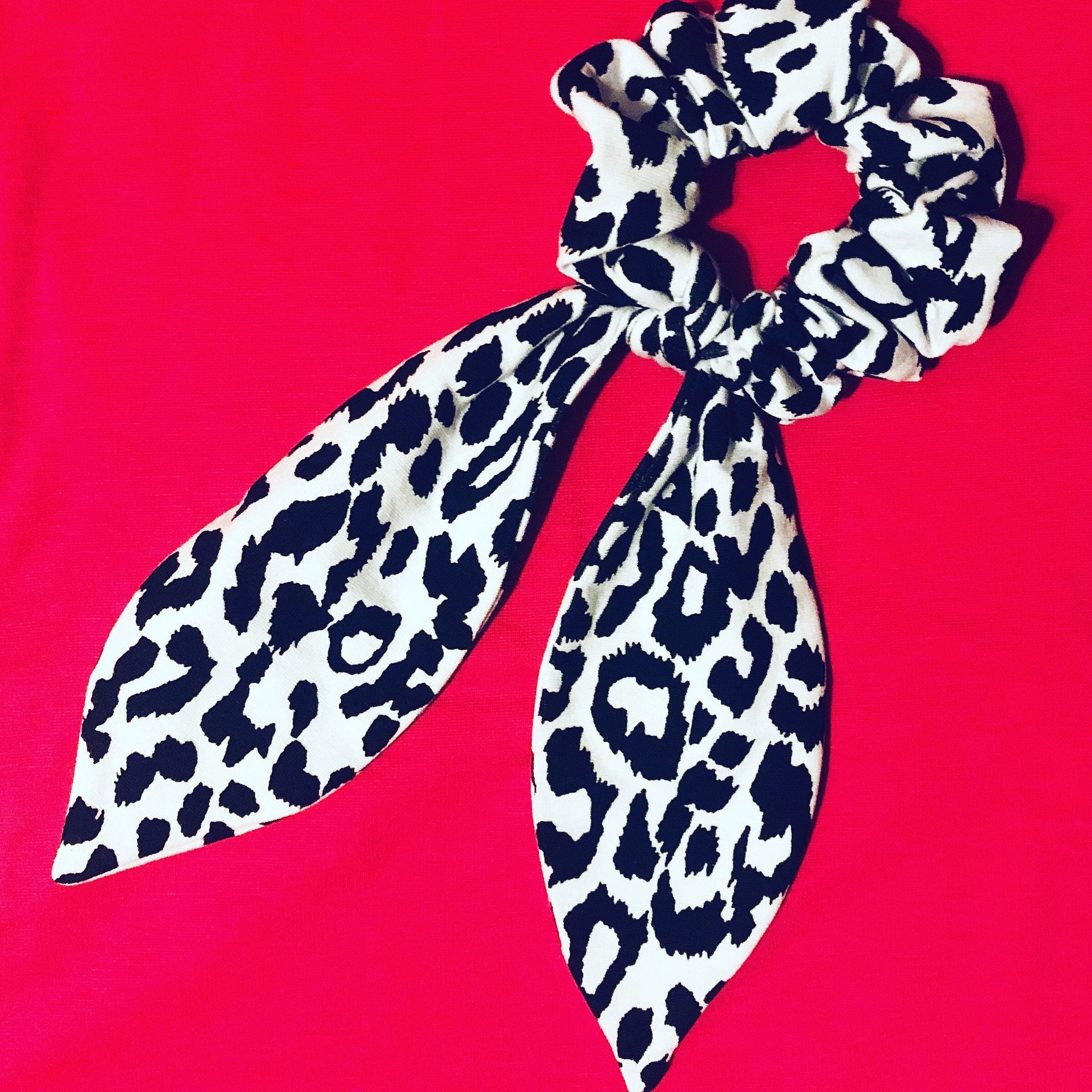 This super cute and sassy hair scrunchie comes in black and white leopard print adorned with a knot tied sash for extra cuteness.