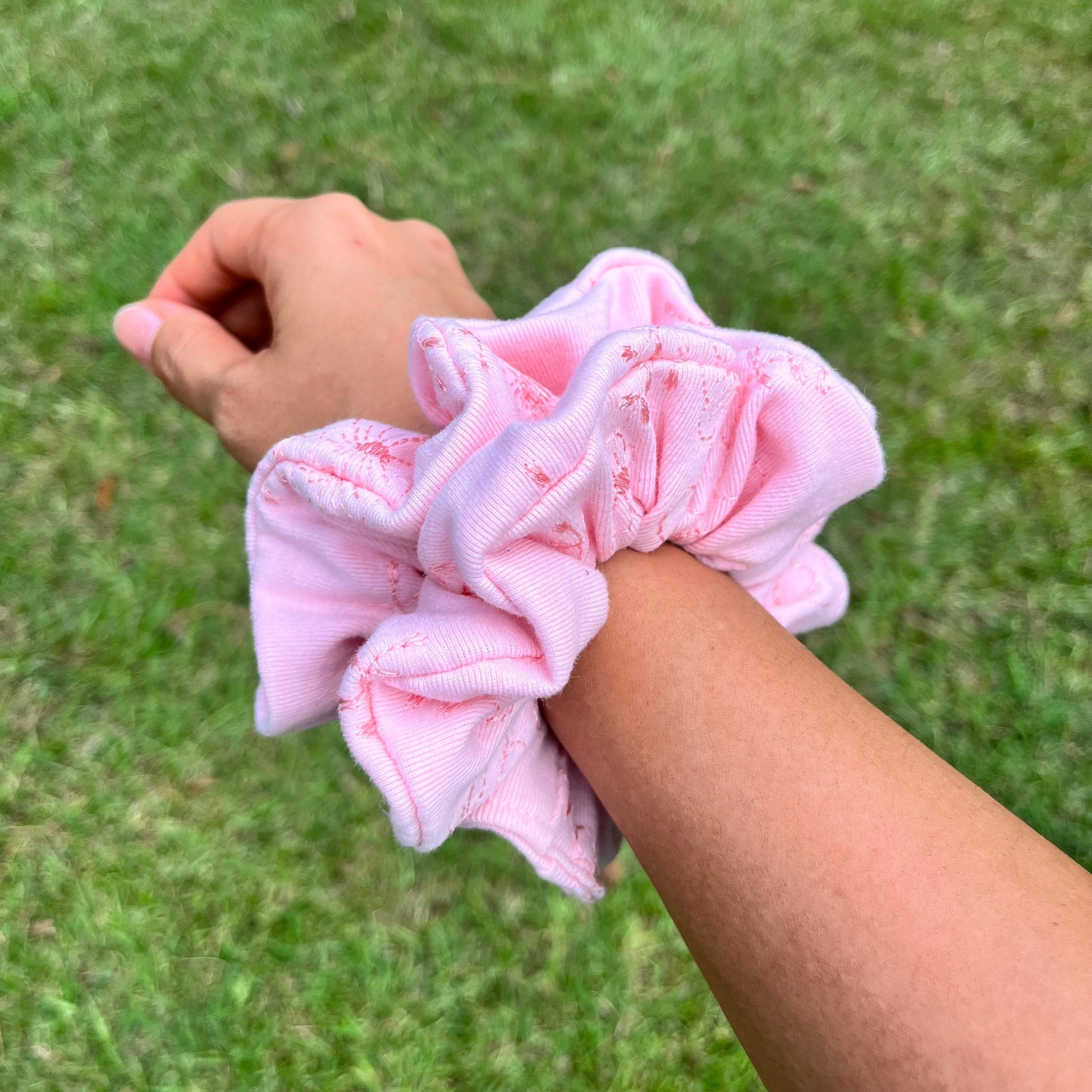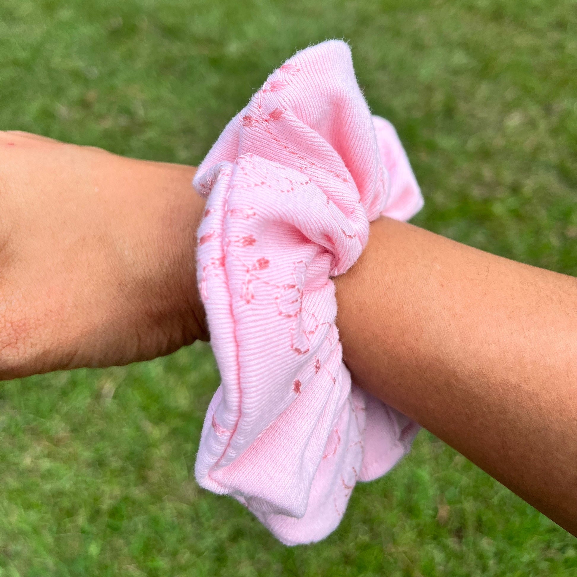 Super Fluffy, soft and light weight. This Pink Jersey knit scrunchie comes in full size only. It features an embroidery Floral Design. This scrunchie looks great in your hair and on your wrist with it's feminine flare. Limited edition quantity available. A must have cute color is made with high quality premium fabric.