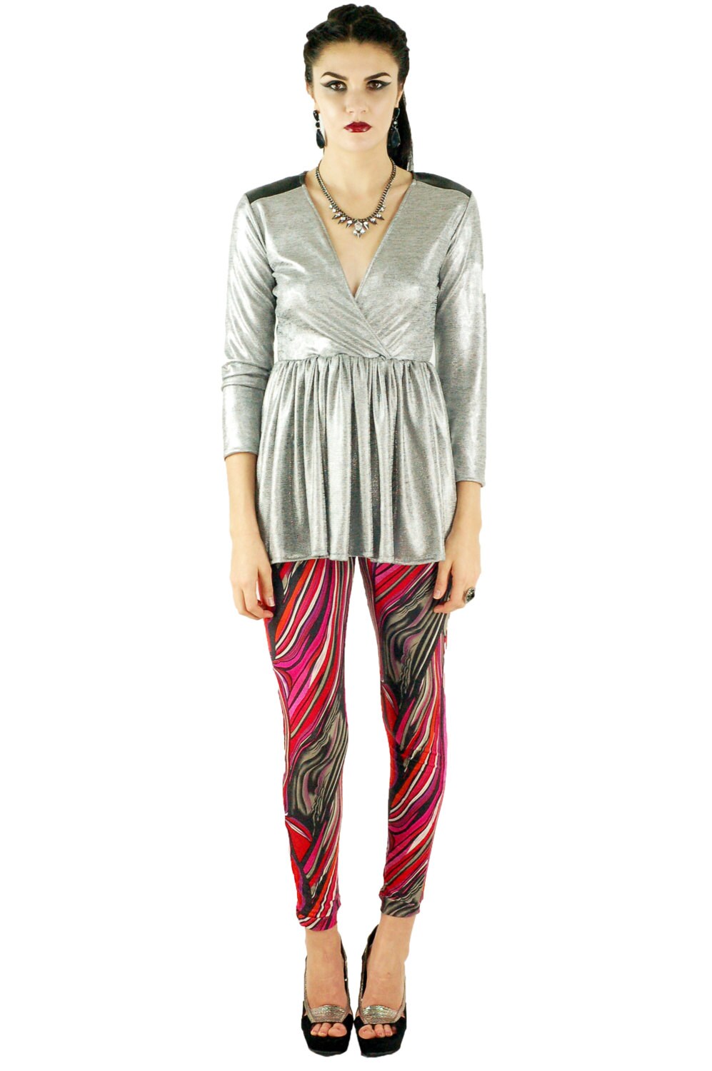 Featured in a bold Abstract Print, these leggings are a great addition to your wardrobe for making a fashion statement. Works well with combat boots, knee high boots, and your favorite top. Waist band has elastic in it.
