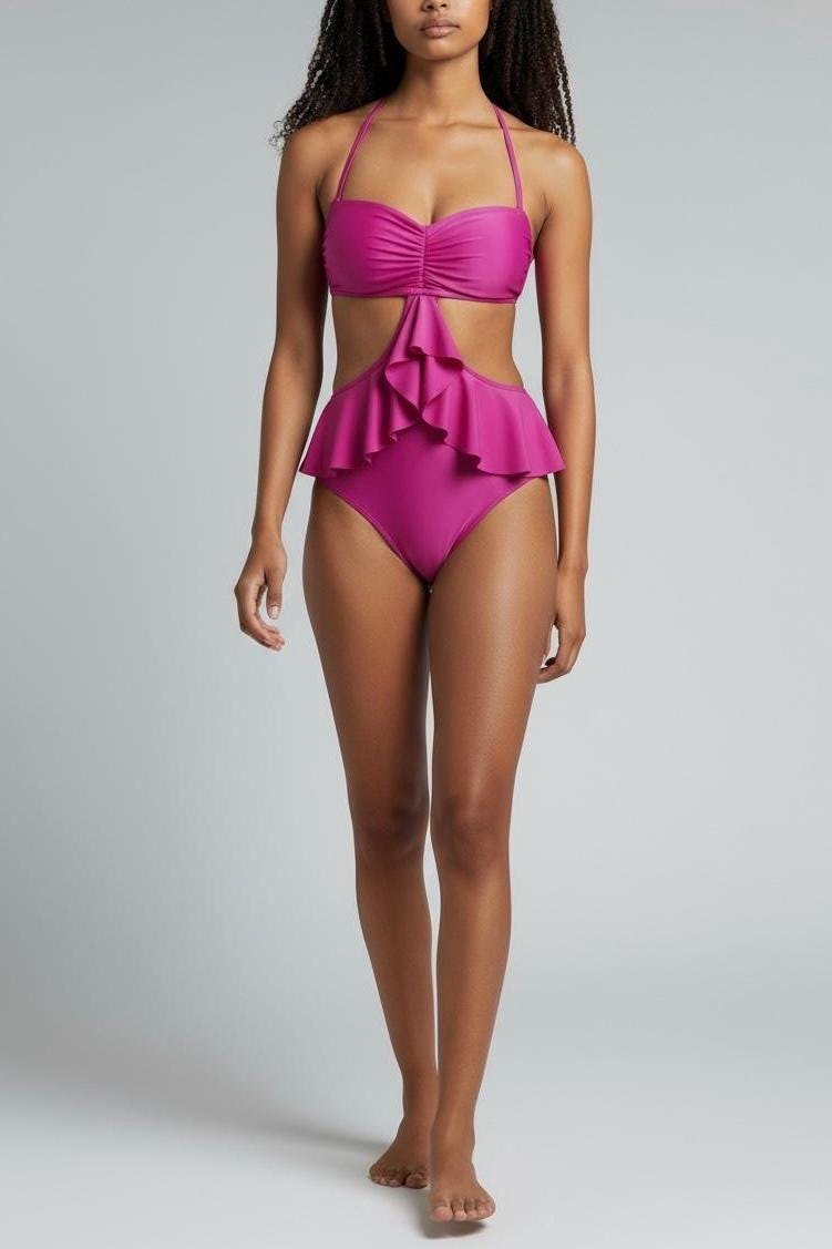 Make a statement in this stunning one-piece swimsuit featuring a playful mix of elegance and allure. The design showcases a ruched bandeau-style top with halter tie straps for adjustable support and comfort. A chic center cutout flatters the waistline, while the cascading front ruffle adds feminine flair and flow. The flounce-style peplum accent wraps around the back for a flirty, figure-enhancing touch. Crafted from smooth, high-quality spandex fabric, this swimsuit combines style and comfort for poolside lounging or tropical getaways.