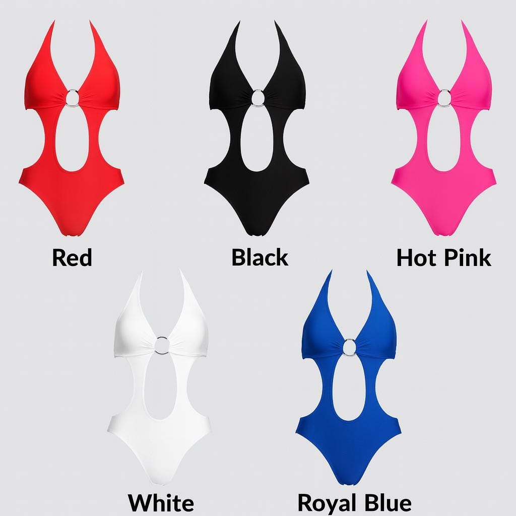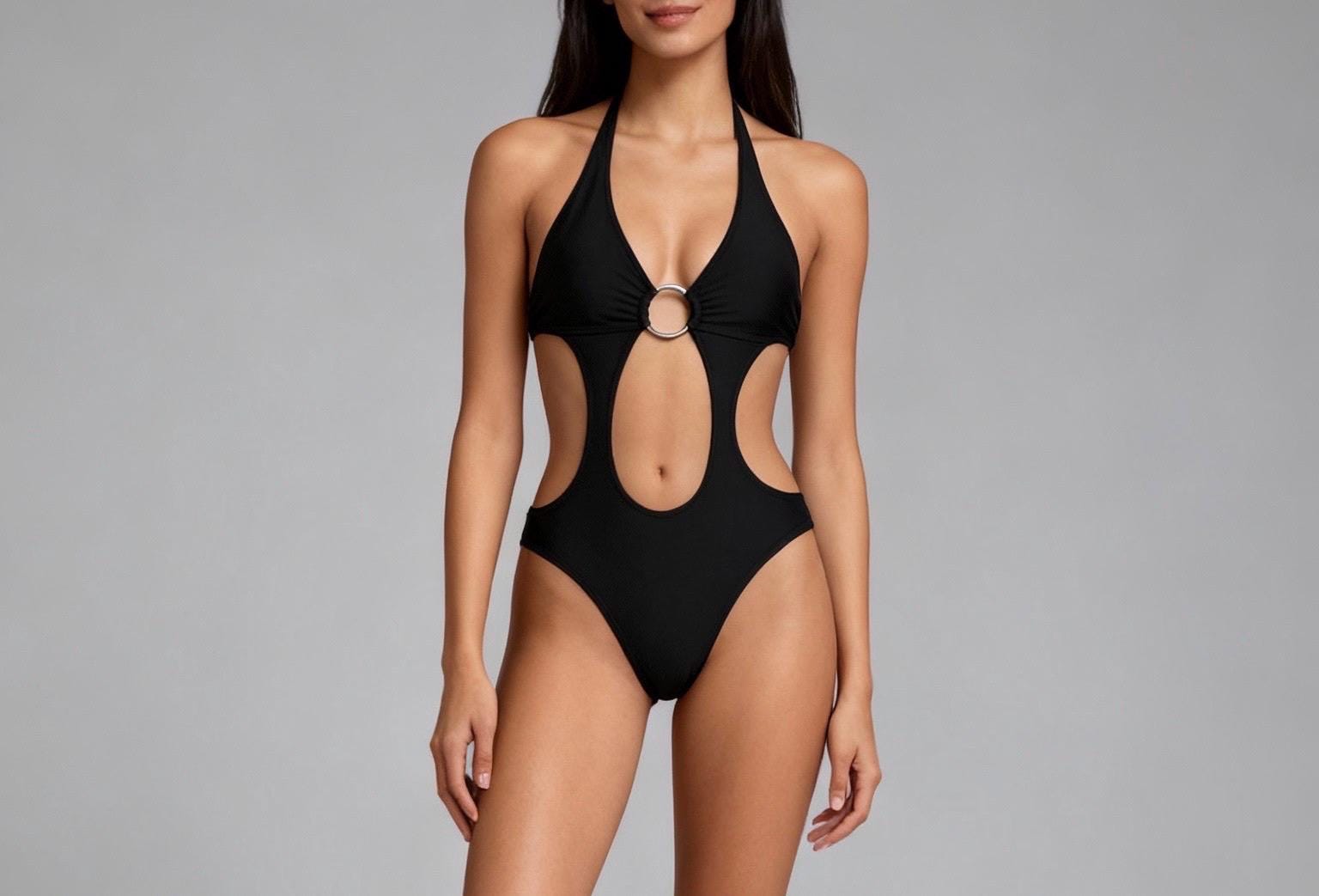 Turn heads in this sleek and sophisticated black cut-out one-piece swimsuit, designed to make a statement from every angle. Featuring a silver ring detail at the center front, this halter-neck monokini flatters your shape with daring tummy cutouts and a smooth, sculpted silhouette. Perfect for pool parties, beach vacations, or resort wear, this swimsuit blends bold style with timeless elegance. The high-leg design elongates your figure, while the adjustable halter tie ensures a comfortable and secure fit.